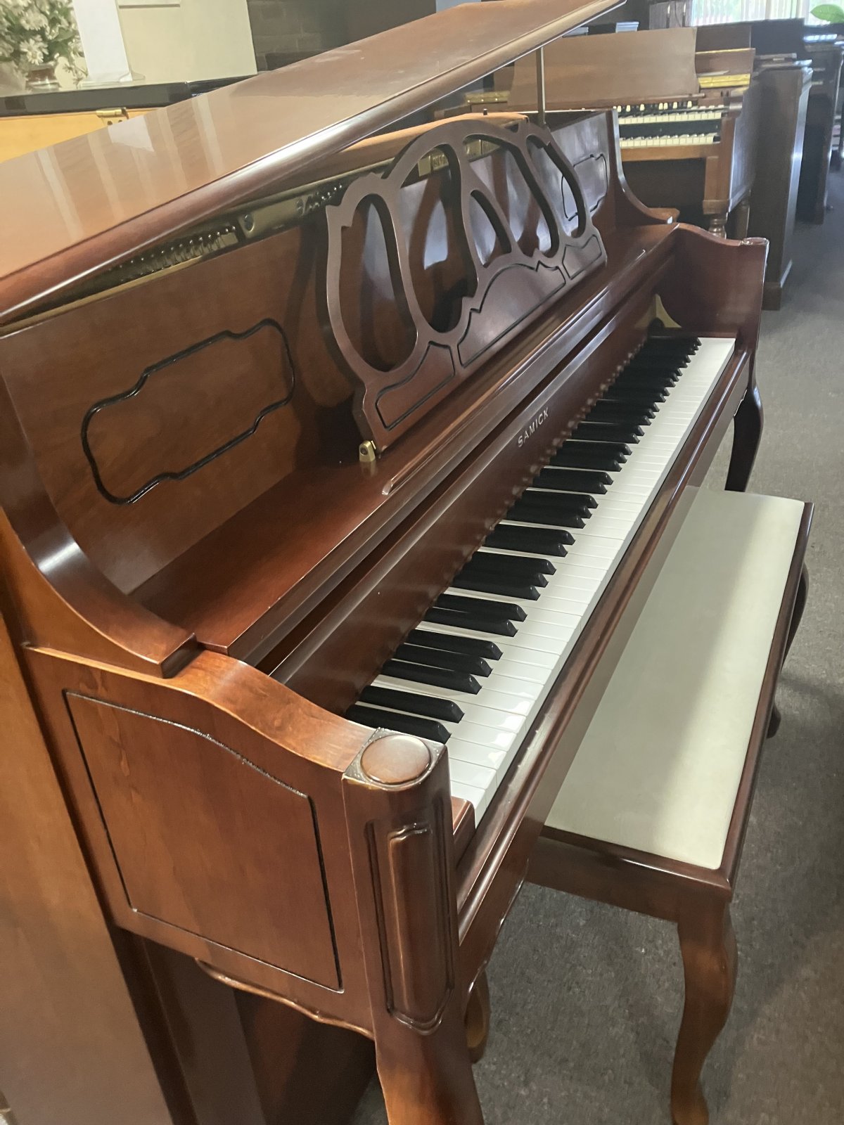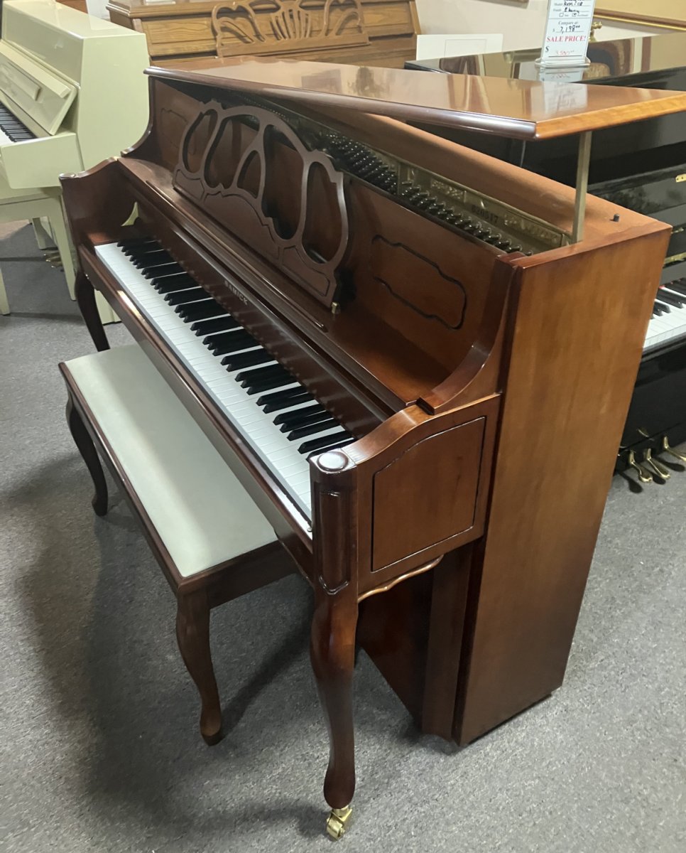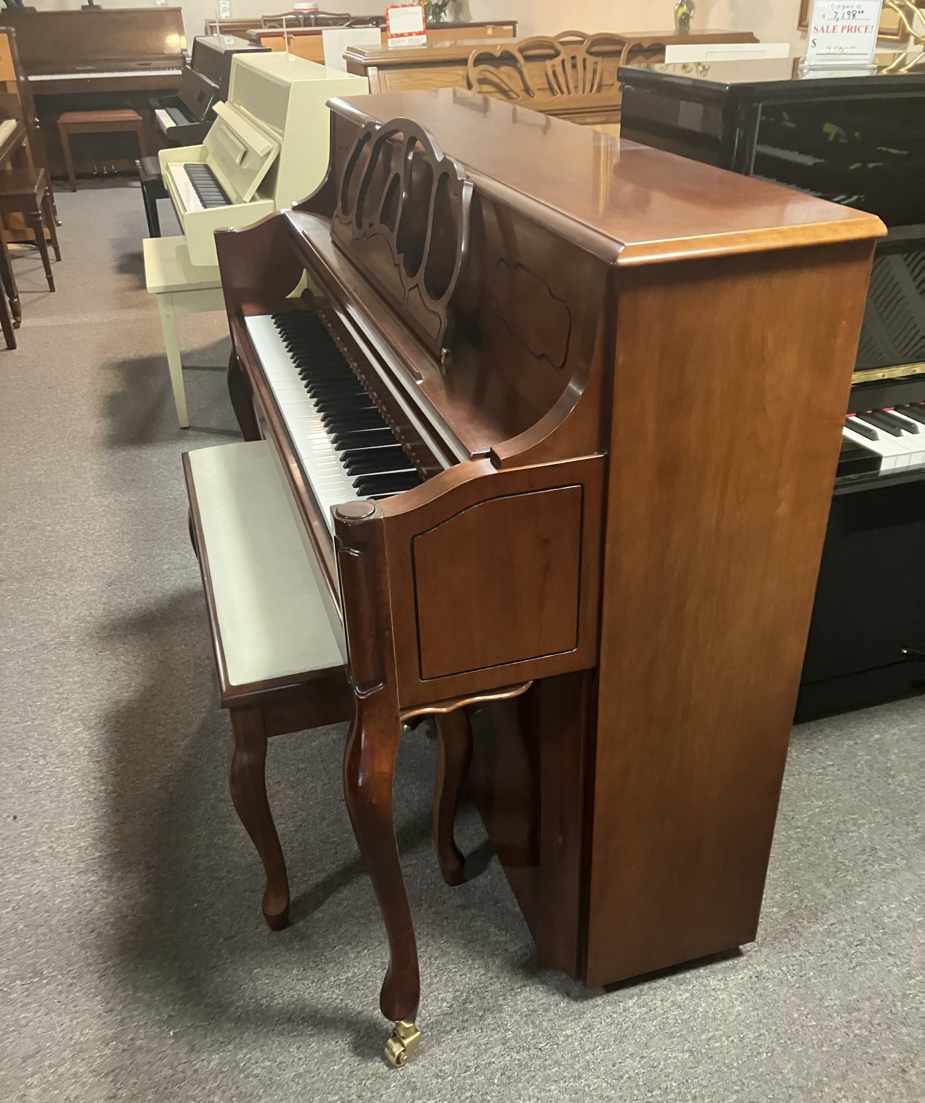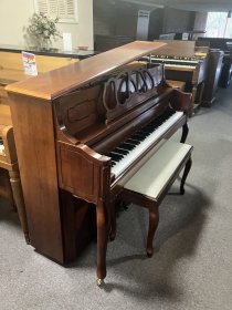 Cable Console. A beautiful console with a flawless Pecan finish. This console piano is in like-new condition throughout. The perfect touch and tone makes playing and listening an absolute joy for everyone. We are pleased to offer our two-year warranty and free local delivery with this superb piano. Ask for serial 461406.